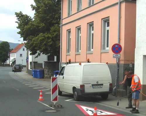 Die Mitarbeiter des Gemeinde-Bauhofes haben heute die Markierungen auf die Straße gebracht.
