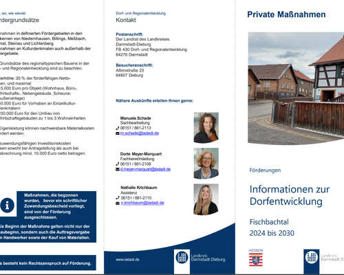 Flyer Dorfentwicklung .pdfDie Förderungen in der Dorfentwicklung unterscheidet sich in der öffentlichen Förderung, welche von der Kommune in Anspruch genommen werden kann, und der Privatförderung, die von den Bürgerinnen und Bürgern der Gemeinde Fischbachtal in Anspruch genommen werden kann.