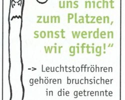 Verbraucher sind dazu verpflichtet, Leuchtstoffröhren und Energiesparlampen sowie alle anderen Elektrogeräte getrennt vom Hausmüll zu entsorgen. Sie können Ihren großen Elektroschrott - wie gewohnt kostenlos - per Hotline 0800 91 60 600 zur Abholung anmelden. Kleingeräte, Leuchtstofflampen und Energiesparlampen nimmt unser Rathaus und unser Bauhof entgegen. Die Hersteller sind dann für eine fachgerechte Entsorgung und Wiederverwendung verantwortlich.