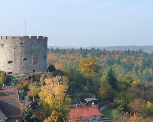 aber auch nicht zuletzt von den zahllosen Besuchern dieses alten Gemäuers in neuerer Zeit, von denen vielleicht mancher, der auf der Plattform steht und seinen Blick sinnend hinüber zum Schloss und über die anmutige Landschaft schweifen lässt, über den Lauf der Dinge räsoniert und sich dabei vielleicht auch des Funktionswandels dieses alten Turmes, vom einst feuerspeienden Geschütz- und Festungsturm zum behäbig dahin gelagerten Aussichtsturm bewusst werden mag - eben des vorhin angesprochenen Wandels der Zwecke -, eines Wandels, den wir nach den Erfahrungen zweier Weltkriege im gerade abgelaufenen Jahrhundert nur allzu freudig begrüßen können.