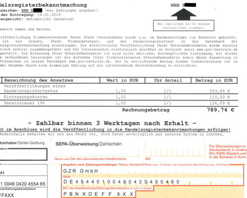 Das Schreiben ist jedoch so verfasst, dass man erst bei gründlichem Lesen des Kleingedruckten erkennt, dass diese Zahlungsaufforderung die Eintragung in ein nichtamtliches Register o. ä. anbietet.