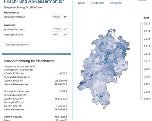 Unternehmen und private Verbraucher können hier ihre Frisch- und Abwasserkosten im Zeitverlauf analysieren und zwischen den Kommunen vergleichen. Jeder kann dabei seine eigenen Verbrauchswerte in seinem Ort zu Grund legen.